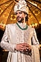Featuring a pale green sherwani in raw silk base with thread and sequins hand embroidery. It is paired with a beige kurta, an embroidered stole and churidar pants. Perfect for wedding ceremonies.