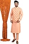 Featuring a peach kurta in cotton silk base. It is paired with matching straight pants and a hand embroidered bundi jacket.