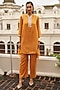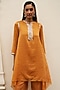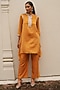 Featuring an amber colored A-line longline top in silk, lurex, cotton and crinkled stripe tissue base with hand applied mirror embroidery. It is paired with straight-cut pants having side pockets and a slip. Accentuate it with hoop earrings and block heels for an evening or festive look.
