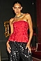 Featuring a crimson red strapless peplum corset in recycled polyester base with 3D floral embroidery, scalloped hem, removable pad pockets and concealed zip closure, including detachable straps detail. It is paired with black straight pants having sequins embroidery, elasticated waist and side zip closure. Accentuate it with dangler earrings and heels for evening parties or date nights.
