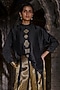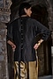 Featuring a black shirt in silk textured viscose base with gold thread embroidery, metallic button placket and dolman sleeves. Accentuate it with pants, hoop earrings and block heels for an evening look.