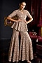 Featuring a caramel colored peplum top in recycled polyester base with a V-neckline, hand applied pearls and sequins, including floral lace and thread embroidery. Accentuate it with pants, hoop earrings and block heels for an evening or festive look.