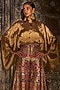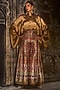 Featuring a gold shirt in banarasi silk tissue base with asymmetric kimono sleeves. Accentuate it with pants, hoop earrings and block heels for an evening or festive look.