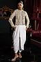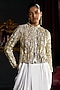 Featuring a gold and silver hand-crushed crop bolero inspired jacket in recycled polyester base with a band collar detail. It is paired with ivory organic viscose dhoti inspired cowl pants having hand sewn pleats and an elasticated waist. Accentuate it with hoop earrings and block heels for an evening or festive look.