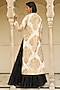 Featuring an ivory and gold longline jacket in banarasi silk brocade base with high side slits and zari floral vase motifs. It is paired with a black art silk recycled polyester maxi crinkled hand-crushed skirt having an elasticated waistband. Accentuate it with statement jewellery and wedges for a festive look or family gatherings.