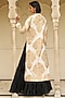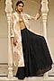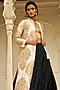 Featuring an ivory and gold longline jacket in banarasi silk brocade base with high side slits and zari floral vase motifs. It is paired with golden tissue bralette and a black recycled polyester maxi crinkled hand-crushed skirt having an elasticated waistband. Accentuate it with statement jewellery and wedges for a festive look or family gatherings.