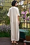 Featuring an ivory draped kaftan dress in satin base with a gathered drape, drop sleeves, hand-applied pleats, metallic buttons and a brooch detail. Style it with statement earrings, flats and a cuff bracelet for an effortlessly chic look, perfect for brunch outings, resort wear or daytime gatherings.