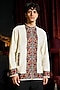 Featuring an ivory kashmiri shacket in organic cotton base with multi-colored thread embroidery, band collar, concealed button-down placket and side seam pockets. Style them with pants and loafers for a refined look. Perfect for festive celebrations, cocktail evenings, weddings, or semi-formal gatherings.