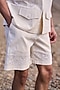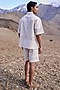 Featuring a natural beige shirt in organic kora cotton base with a notch collar, patch pockets and schiffli embroidery. Itt is paired with shorts. Perfect for a beach vacation, summer getaway, or relaxed brunch by the shore.