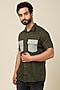 Featuring an olive green shirt in cotton base with half sleeves, contrast patch pocket detailing, mismatched pocket shapes, and a concealed button placket. This contains one piece only.