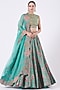 Featuring an aquarium green lehenga in silk chanderi, mulmul, and hard net base with print. It is paired with a matching blouse having sequins work and an organza dupatta.