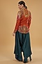 Featuring a multi-colored jacket in chanderi silk and modal satin base with mirror work. It is paired with blue flared pants. Accentuate it with statement earrings and heels for a festive occasion or engagement ceremony.