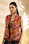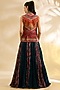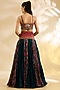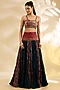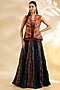 Featuring a blue crinkle skirt in silk base with abstract print, hand and machine embroidery. It is paired with a bustier and jacket. Accentuate the look with statement jewellery, clutch and block heels for festive celebrations, mehendi, haldi or wedding ceremonies.