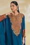 Featuring a blue kaftan in silk base with hand and machine embroidery. It is paired with straight pants. Style with polki jewellery, soft curls and heels for festive occasions, weddings or sangeet ceremonies.