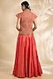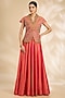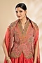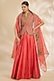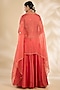 Featuring a gajari pink cape in silk base with hand and machine embroidery. It is paired with a jacket and a skirt. Accentuate it with dangler earrings and heels for a festive occasion, wedding, sangeet or engagement ceremony.