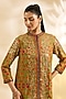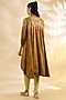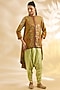 Featuring a green trail jacket in silk base with floral print, hand and machine embroidery. It is paired with pants. Accentuate the look with statement jewellery, clutch and block heels for festive celebrations, mehendi, haldi or wedding ceremonies.