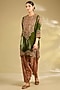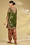 Featuring a green kurta in velvet and silk base with hand and machine embroidery. It is paired with pants. Style this with statement earrings and heels for a festive occasion, mehendi, wedding or engagement ceremony.