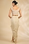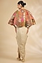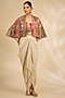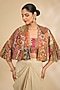 Featuring an ivory boho crop jacket in silk base with floral print, hand and machine embroidery. It is paired with a bustier and a draped skirt. Accentuate it with chunky gold earrings, a clutch and pump heels for a cocktail, sangeet or evening parties.