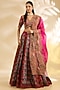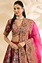 Featuring a magenta and blue lehenga in silk and organza base with abstract print, hand and machine embroidery. It is paired with a blouse and dupatta. Accentuate the look with statement jewellery, clutch and block heels for festive celebrations, mehendi, haldi or wedding ceremonies.