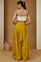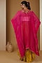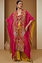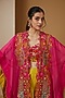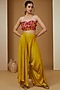 Featuring a magenta cape in organza and modal satin base with mirror work. It is paired with flared pants and a bustier. Accentuate with statement jewellery and heels for a festive occasion or haldi ceremony.