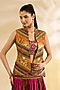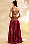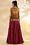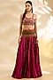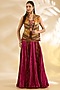Featuring a magenta crinkle skirt in silk base with abstract print, hand and machine embroidery. It is paired with a bustier and jacket. Accentuate the look with statement jewellery, clutch and block heels for festive celebrations, mehendi, haldi or wedding ceremonies.