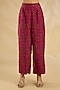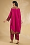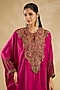 Featuring a magenta kaftan in silk base with hand and machine embroidery. It is paired with pants. Accentuate it with statement earrings and heels for a complete look.