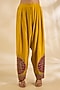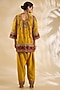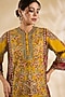 Featuring a mustard kurta in silk and organza base with hand and machine embroidery. It is paired with pants and a dupatta. Accentuate it with kundan polki jewellery and block heels for a haldi or festive ceremony.