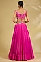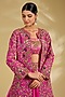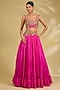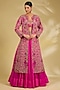 Featuring a neon pink jacket in silk base with hand and machine embroidery. It is paired with a bustier and a skirt. Accentuate it with statement jewellery and heels for festive occasions or wedding ceremony.