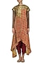 This set features an orange asymmetrical tunic in chanderi base with geometric print all over and gold sequins work on the yoke. It is paired with silk pleated dhoti pants.