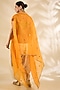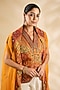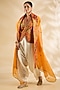 Featuring an orange jacket in silk and organza base with hand and machine embroidery, including floral print. It is paired with pants and a cape. Accentuate with statement jewellery and heels for a festive occasion, sangeet or wedding ceremony.