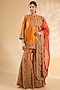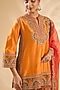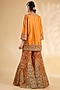Featuring an orange kurta in silk base with hand and machine embroidery. It is paired with sharara pants and a dupatta. Style this with statement earrings and heels for a festive occasion, wedding or engagement ceremony.