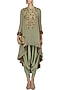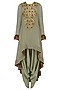 This set features a pale blue high low asymmetrical tunic in chiffon base with gold floral sequins embroidery on the front. It is paired with matching pale blue silk dhoti pants.