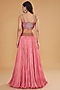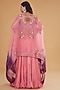 Featuring a pink crushed lehenga in chanderi silk and organza base with embroidered belt. It is paired with a patchwork high-low cape and a zig-zag bustier. Accentuate it with statement jewellery or heels for a sangeet or wedding ceremony.