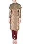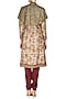 This set features a pink floral printed sherwani in raw silk base with hand embroidery floral pattern along the hem, front panel and cuffs. It comes along with a gold sequin cape and maroon gathered pants with a waist tie up. FIT: Cut for relaxed fit.