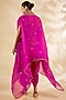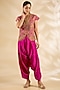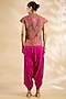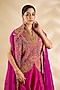 Featuring a pink jacket in silk and organza base with hand and machine embroidery, including floral print. It is paired with pants and a cape. Accentuate with statement jewellery and heels for a festive occasion, sangeet or wedding ceremony.