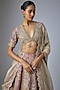 Featuring a powder pink lehenga in silk base with floral print, mukaish hand and machine embroidery. It is paired with a blouse and a dupatta. Accentuate the designer lehenga with silver jewellery, a clutch and embellished heels for a wedding, sangeet or engagement ceremony.