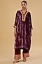 Featuring a purple kaftan kurta in velvet base with embroidery. It is paired with palazzo pants. Accentuate with statement jewellery and heels for festive occasions.