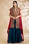Featuring a red cape in organza base with hand and machine embroidery. It is paired with an embroidered jacket and a skirt. Accentuate it with kundan polki jewellery and block heels for a wedding or sangeet ceremony.
