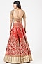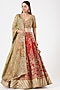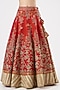 Featuring a red lehenga in raw silk, chanderi, hard net, and mulmul base. It is paired with a contrasting blouse and a dupatta.