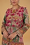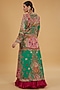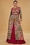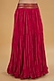 Featuring a red crushed skirt in chanderi silk base. It is paired with a raw silk patchwork jacket. Accentuate it with statement earrings and heels for a sangeet or engagement ceremony.