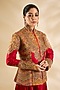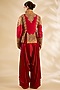 Featuring a red jacket in raw silk and silk base with hand and machine embroidery. It is paired with pants. Accentuate with statement jewellery and heels for a festive occasion, sangeet or wedding ceremony.