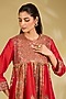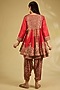 Featuring a red frock dress in silk base with hand and machine embroidery. It is paired with salwar pants. Style it with a clutch and heels for a festive night or sangeet ceremony.