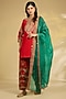 Featuring a red kurta in silk base with hand and machine embroidery. It is paired with salwar pants and a dupatta. Accentuate it with dangler earrings, a potli bag and juttis for a wedding or sangeet ceremony.