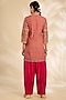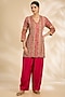 Featuring a red kurta in silk base with hand and machine embroidery. It is paired with pants. Accentuate it with dangler earrings and heels for a festive occasion, family gathering, sangeet or engagement ceremony.
