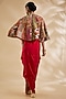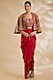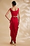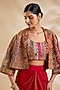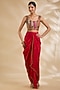 Featuring a red crop jacket in silk base with hand and machine embroidery. It is paired with an embroidered bustier and a skirt. Accentuate it with kundan polki jewellery and block heels for festive occasions or sangeet ceremony.