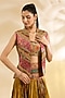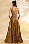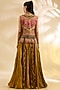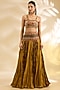 Featuring a yellow crinkle skirt in silk base with abstract print, hand and machine embroidery. It is paired with a bustier and jacket. Accentuate the look with statement jewellery, clutch and block heels for festive celebrations, mehendi, haldi or wedding ceremonies.