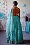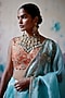 Featuring a powder blue pleated lehenga in brocade base. It is paired with a rust orange sleeveless blouse having sequins, zari, zardosi and jaal embroidery, including a zardosi guchha jaal dupatta. Accentuate it with dangler earrings and heels for a festive occasion or wedding ceremony.