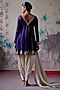 Featuring a purple paneled short anarkali in georgette base with aari, zardosi and sequins embroidery. It is paired with ivory tulip pants and an organza dupatta. Accentuate it with dangler earrings and heels for a festive occasion or wedding ceremony.
