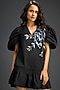 Featuring a black mini dress in cotton base with ruffled hem, puffed sleeves and orange floral embroidery. Accentuate it with statement earrings and heels for a brunch or an evening look.