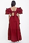 Featuring a deep red maxi dress in cotton base with puffed sleeves, pleated frills, and a V-neck.